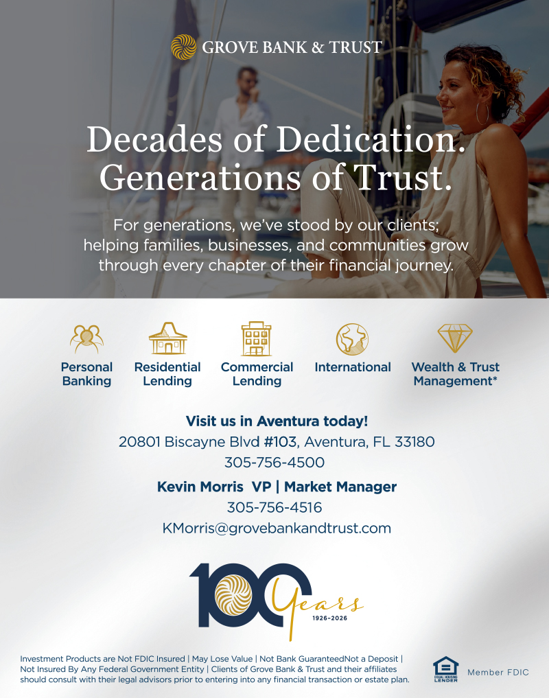 Grove Bank & Trust, founded on July 12, 1926, is the longest-operating bank in Miami-Dade County. With nearly 100 years of experience, we proudly offer a full range of personal and business banking services, residential mortgages, investments, and wealth management solutions.
