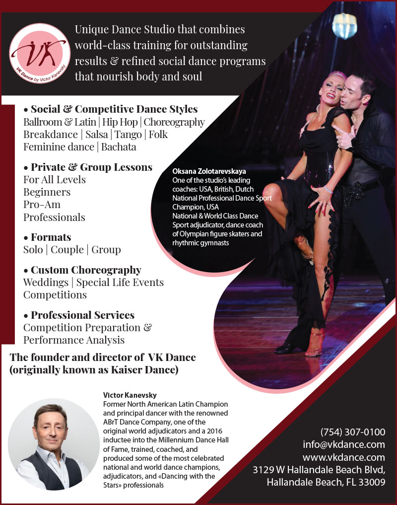 At VK Dance Arena, a team of skilled professionals, led by founder Victor Kanevsky, teaches a variety of dance styles! Offering classes for both kids and adults, you can learn Ballroom, Latin, Hip-Hop, Ballet, Salsa, Tango, and Folk. Book your introductory class today and step into the exciting world of dance!