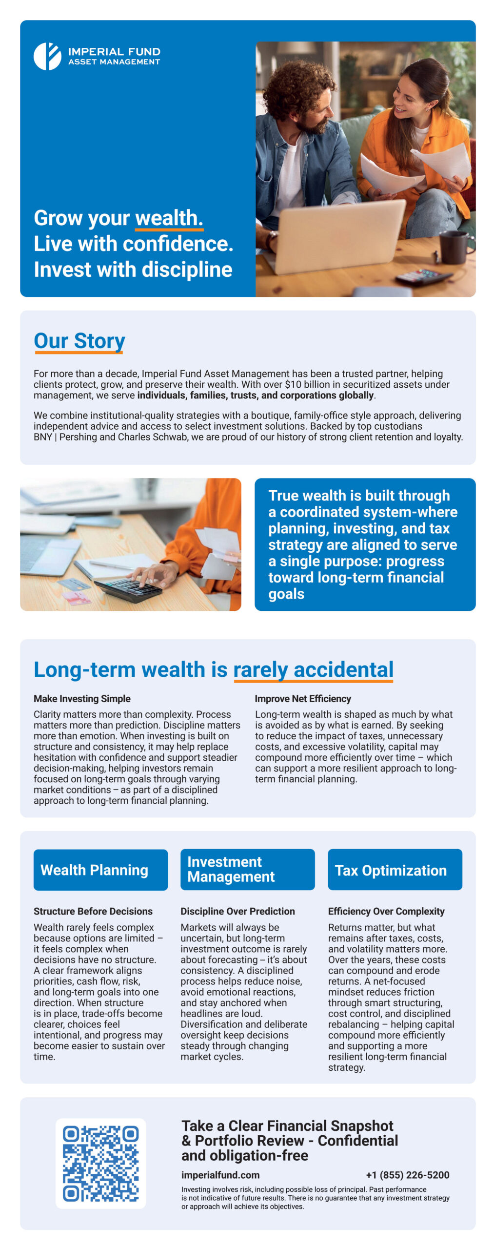 Imperial Fund Asset Management is an SEC-registered investment firm providing first-class service to both companies and individuals seeking investment opportunities. With $9.8Bn in managed securitized assets, we support CEE, CIS, and international HNW clients and their advisors by remotely opening and managing personal and corporate accounts with leading U.S. banks, delivering a seamless, institutional-quality investment experience. We speak Russian.