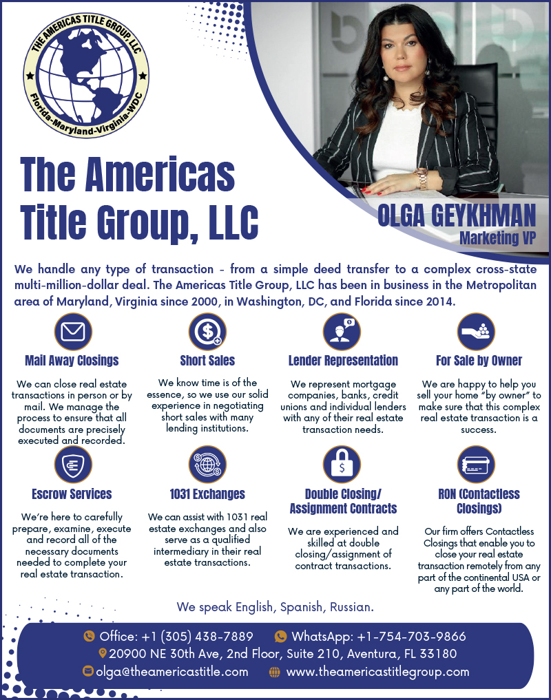 Title Insurance Escrow and Closings. Full-Service Agency for all of your title needs throughout the State of Florida – Title Services, Transaction Coordination, Legal Services. Fluent in English, Russian, and Spanish. Contact Olga Geykhman.