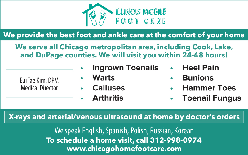 Chicagoland Mobil Home Foot Care In-home podiatrists visits. Same day, evenings and weekends appointments available.