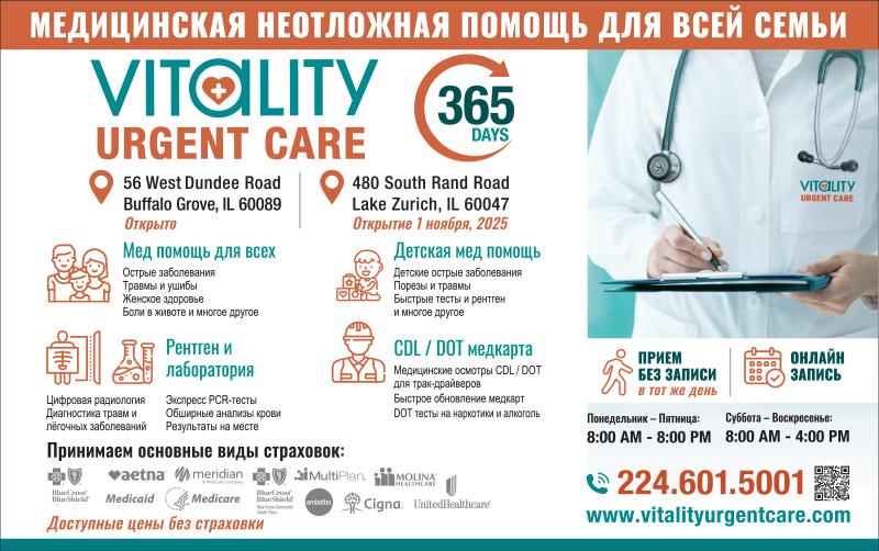 Vitality Urgent Care in Buffalo Grove provides fast, professional care when you need it most. Our walk-in clinic is designed for urgent medical needs, offering immediate treatment for a variety of conditions. From pediatric care to women’s health, we handle everything from minor injuries to illnesses with expert care. Services include X-rays, IV therapy, on-site lab tests, and physical exams, such as CDL/DOT testing. No appointment necessary – just walk in and receive the care you deserve. We accept patients with and without insurance, and we also offer Russian-speaking services for your convenience. Open daily: Monday–Friday 8 AM–8 PM, Saturday–Sunday 8 AM–4 PM